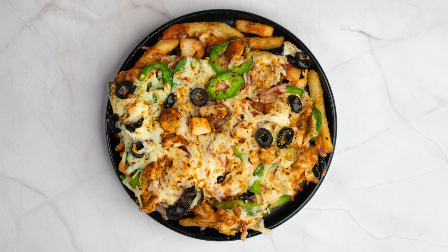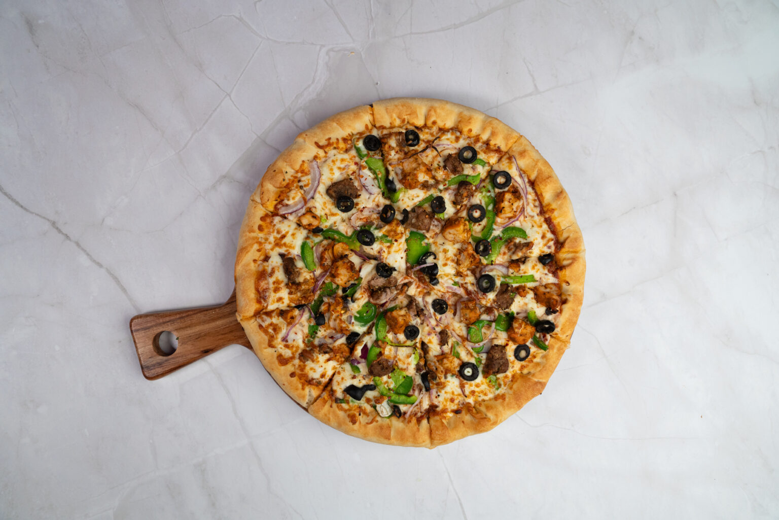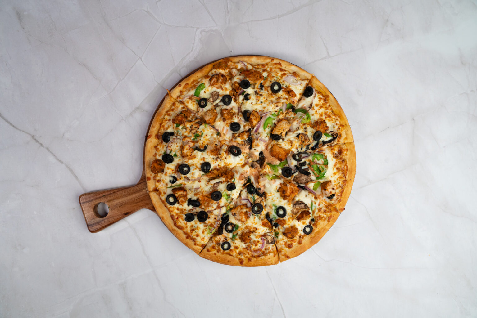 Karachi style pan pizza base of marinara sauce, beef behari kabab onions, Chicken Tikka, green pepper, olives and mozzarella cheese