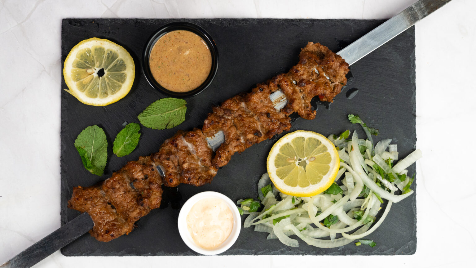 Full skewer of beef behari kabab thinly sliced pre marinate with home made spices served with onions and BRK Chutney