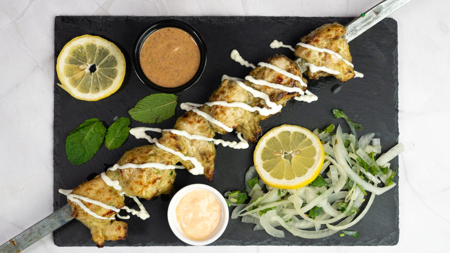 Full skewer of Chicken malai boti (white meat) pre marinated with home made spices, cream served with onions and BRK Chutney