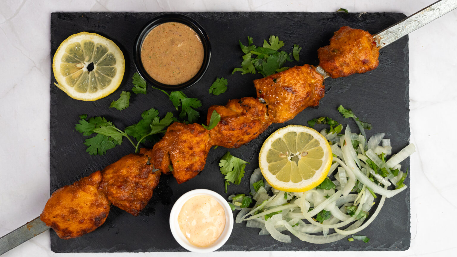 Full skewer of Chicken tikka boti (white meat) pre marinated with home made spices served with onions and BRK Chutney