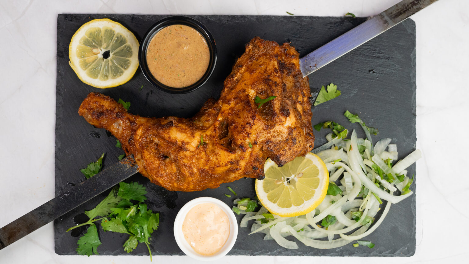 Full bone in chicken tikka leg pre marinated with home made spices, served with onions and BRK Chutney