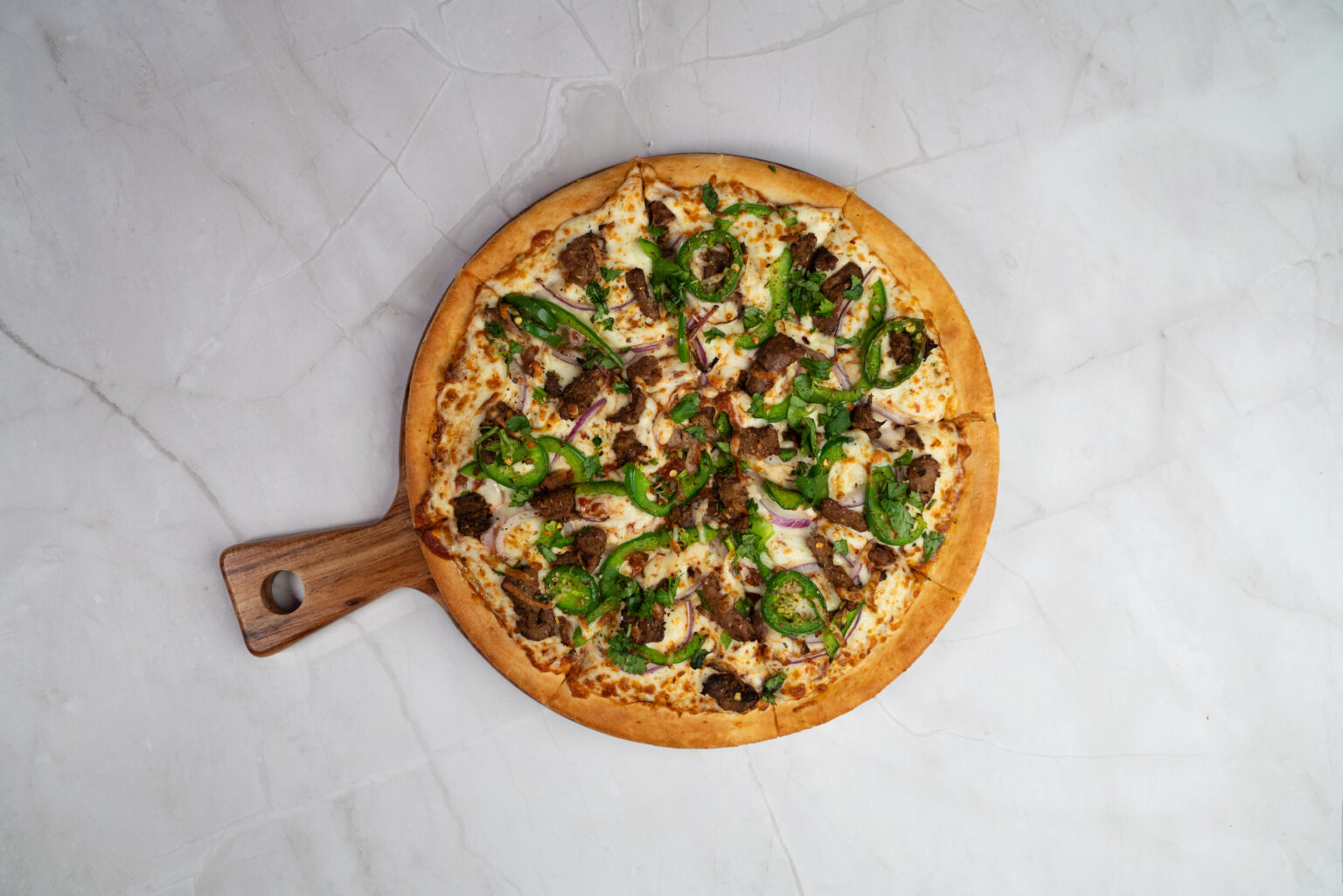 Karachi style pan pizza base of homemade behari sauce, beef behari kabab, onions , green pepper, jalapeños , cilantro , chilli flakes topped with mozzarella cheese