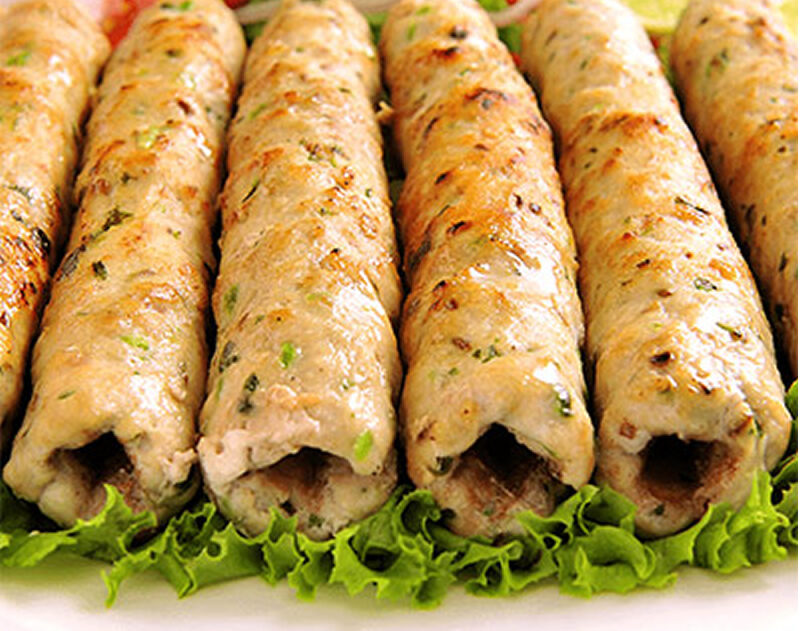 Full skewer of beef goLA kabab grounded meat marinateD with home made spices served with onions and BRK Chutney