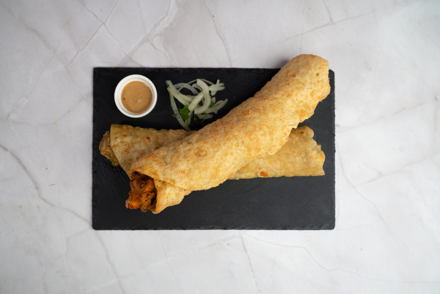 Chicken malai boti skewer with onions , coriander wrapped in a paratha of your choice along with our home-made BRK chutney