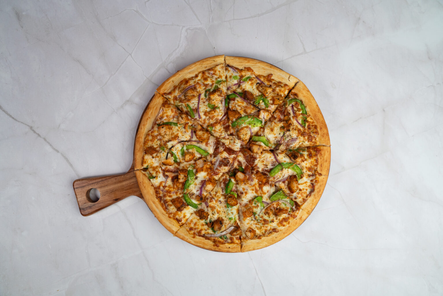 Karachi style pan pizza base of homemade tikka sauce , chicken tikka , green pepper , onions , chilli flakes and mozzarella cheese