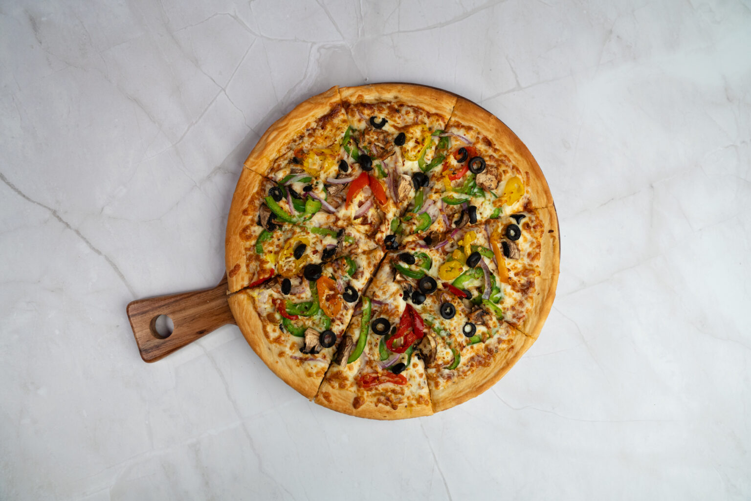 Karachi style pan pizza base , Homemade marinara sauce ,onions , green pepper , hotpeppers , mushrooms ,olives ,jalapeños and mozzerralla cheese